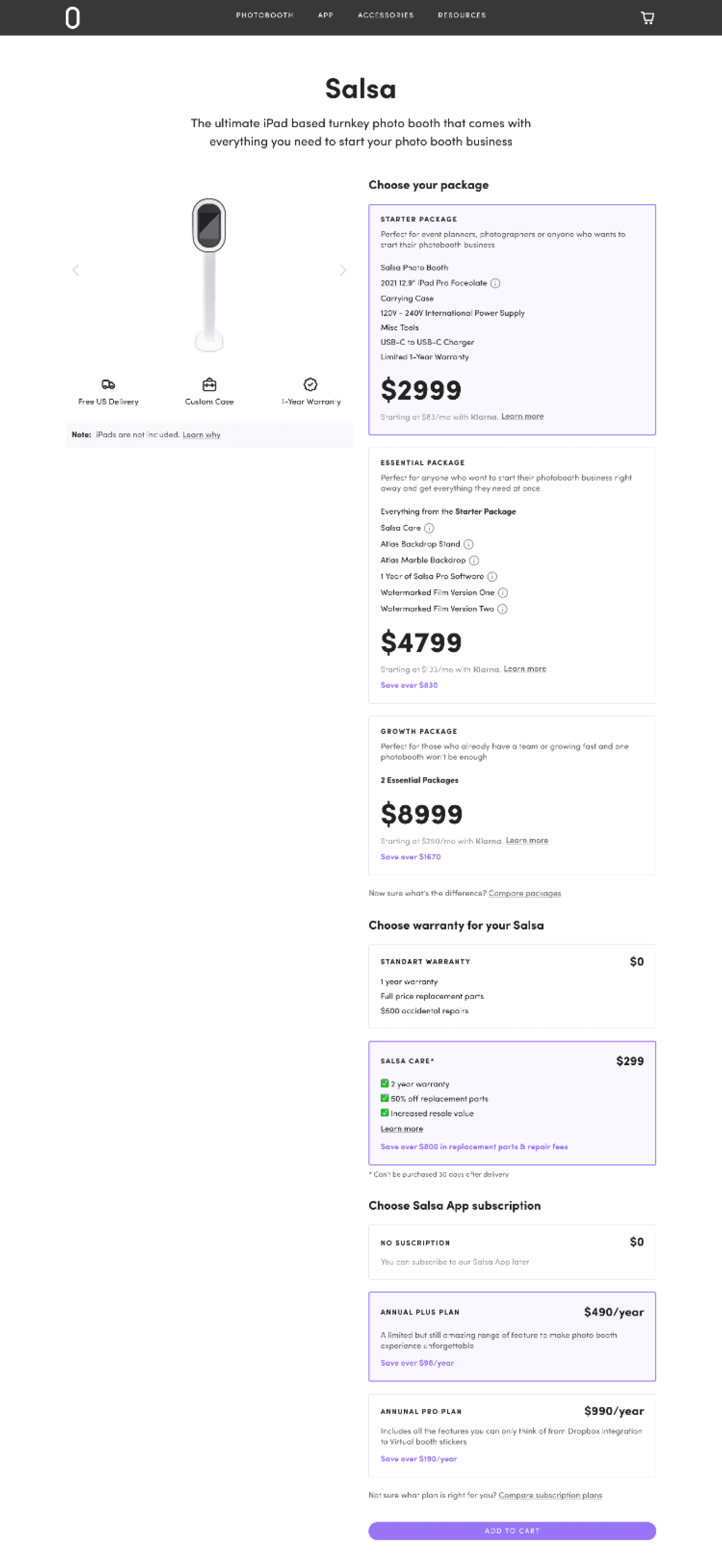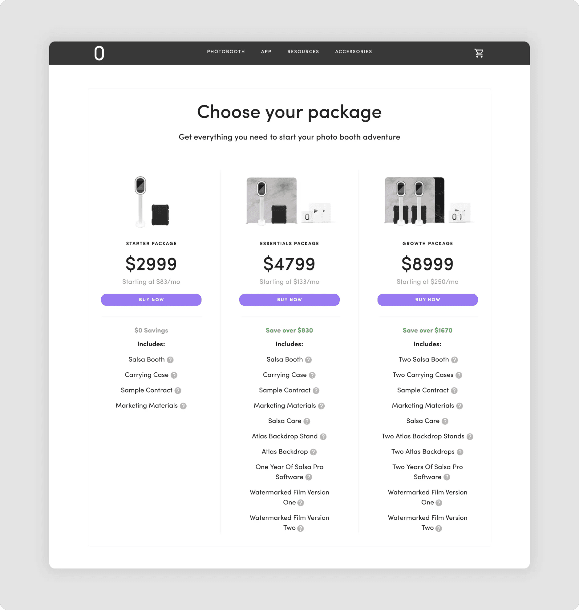 One of my tasks involved redesigning a website page page. This page features a bundle offer where potential customers can explore the product and consider purchasing a photo booth. My main aim with the redesign was to ensure that potential customers could easily see the benefits they would receive along with the main product.