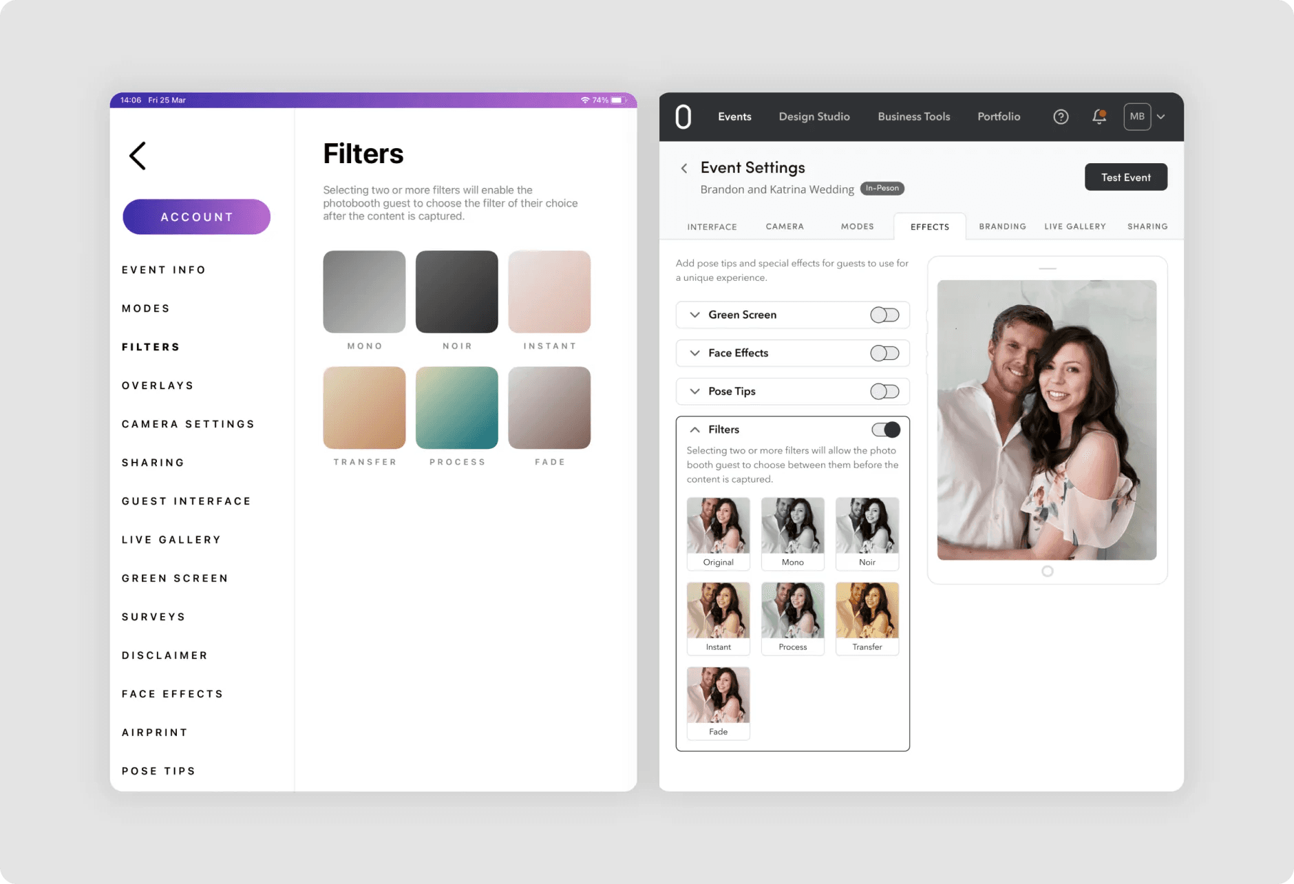 One exciting innovation we introduced was the ability for users to preview their selected settings directly, a departure from the previous setup where settings were only visible upon launching a photo booth event on an iPad. Additionally, by consolidating certain settings, we streamlined the event setup process and eliminated redundancy.